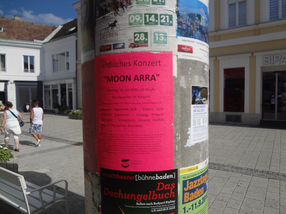 MoonArra's concert tour of Vienna-Dublin from July 21-July 27 featured 5 concerts and a music workshop. Concerts at Vienna Au, Kulturezene Kottingbrunn, Cafe Concerto club and culminating at the historic Baden. After Baden Madhuri and Jagadeesh went on to Dublin, Ireland where they were featured at JJ's,as a duo along with 3 other artists from Finland, Italy and Dublin. Thanks to Peter Natterer, John Morissey of Hotel Palindrone, Vienna. Promilla Shaw and Honor Heffernan of Dublin.